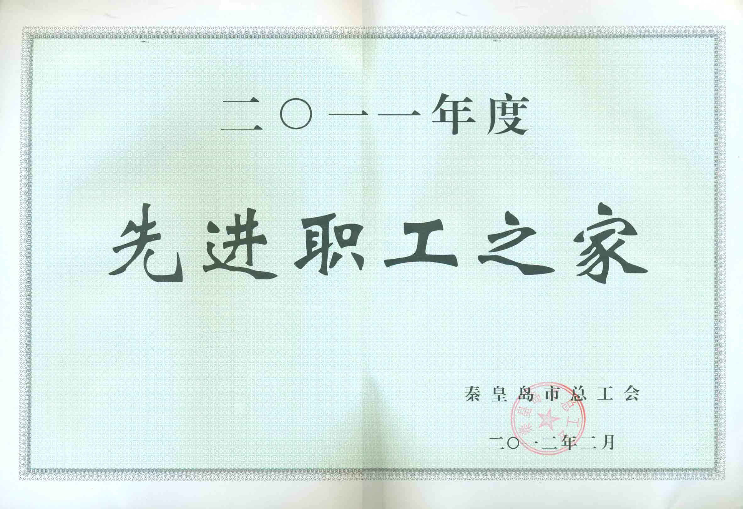 秦皇島市總工會授予我院工會“二零一一年度先進職工之家”稱號。